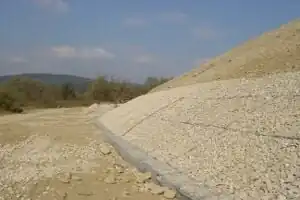 A gabion is a cage, cylinder, or box filled with rocks, concrete, or sometimes sand and soil for use in civil engineering, road building, and landscaping. For erosion control, caged riprap is used. For dams or in foundation construction, cylindrical metal structures are used. Gabions originated in medieval siegeworks. Leonardo da Vinci designed a type of gabion for the foundations of the San Marco Castle in Milan.[1]