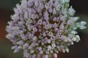 When garlic flowers, it produces a pompom style flower head which contains clusters of purplish-white, pink, green-white or white flowers. This grows on a stalk that reaches a height of around 60cm (24 inches), or higher.