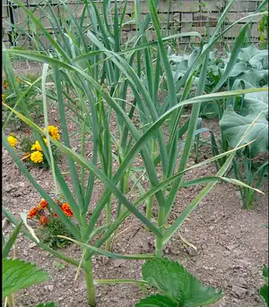 Garlic has flat lightly colored green leaves. These grow to a length of approximately 30cm (12 inches) and measure around 2.5cm (1 inch) across.