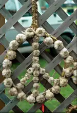 Harvest garlic when the leaves have yellowed and the top of the stalk is falling over. If you pull the cloves out with the leaves, you can braid the leaves together for aiding aerial storage, a well-known and time-tested way of keeping garlic. Wash the bulbs after pulling out, to remove soil. Then allow the bulbs to dry in the sunshine to dry. String the garlic bulb stalks together at the top, then braid into a rope. Hang in a cool, dry place with good airflow. When needed, simply pull off single cloves to use.
