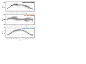 "Monthly mean DNI is much less variable over the course of the year. It peaks in March and April, with a March value of 5.45 kWh/m2/day. DNI is lowest in December, at 4.53kWh/m2/day, but all months during July–January are below4.85. DNI monthly means are more variable year-to-year, however."