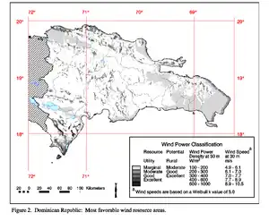 "The wind resource in the Dominican Republic is strongly dependent on elevation and proximity to the coastline. In general, the wind resource is best on hilltops, ridge crests, and coastal locations that have excellent exposure to the prevailing winds from the east. The extreme southwestern and northwestern regions of the country are estimated to have the greatest number of areas with good-to-excellent wind resources for utility-scale applications, because the upper-air winds and ocean winds are greatest in these regions."[10]
