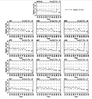 "The highest wind resource from June to August and December to February, with a maximum in July and a minimum in October. The diurnal pattern of wind speeds on exposed ridge crests tend to have the highest speeds during the night and early morning hours and lowest during mid-day."[13]