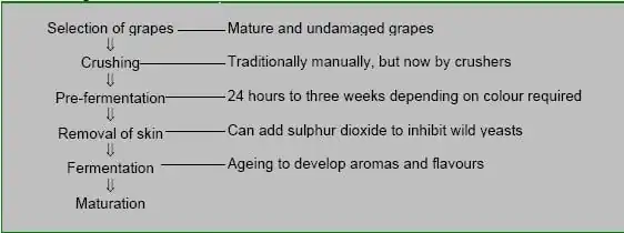 Ripe and undamaged grapes should be used. Red grapes are crushed to yield the juice plus skins, which is known as must.