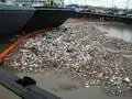 Composition of marine garbage/plastics varies from area to area. Although a general trend seems to be that 80% of the marine trash comes from land, storms wash garbage off highways and city streets, down streams and rivers, and out to sea (there is also direct dumping of trash into water bodies). The rest come from ships, cruise lines that illegally dump their waste, oil platforms, or fishing boats. "In addition, thousands of cargo containers fall overboard in stormy seas each year, spilling their contents. One ship heading from Los Angeles to Tacoma, Wash., disgorged 33,000 blue-and-white Nike basketball shoes in 2002. Other loads lost at sea include 34,000 hockey gloves and 29,000 yellow rubber ducks and other bathtub toys."