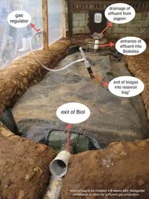 - ↑ the IRRI Biobolsa system includes: the gas regulator system with sulfur filter, hose to connect to Biobolsa system and valve, a biogas reservoir bag and plastic net to suspend bag from roofing, a recycled PET plastic blanket to protect the Biobolsa, a repair kit for the Biobolsa and a use and maintenance manual for the whole system. <http://sistemabiobolsa.com/> Manual de Instalación.