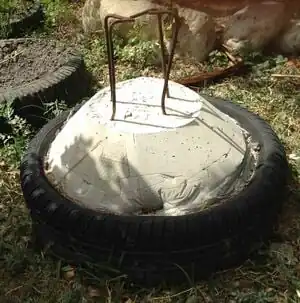 The Elephant Foot in Haiti Communitere is a demonstration piece for a style of building that utilizes concrete, tires, and rebar to make earthquake resistant wall foundations. The Elephant Foot was created by Architecture Sans Frontières. Tires can absorb a lot of the movement and stress caused by earthquakes. When used as a building material they can make earthquake safe foundations, while at the same time upcyling a material that would otherwise be waste. Large shake table tests are needed to confirm the structural integrity of the Elephant Foot, but one wall was tested on the bed of a moving truck at Haiti Communitere, and it survived without damage.