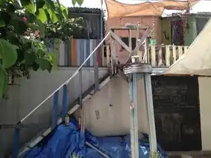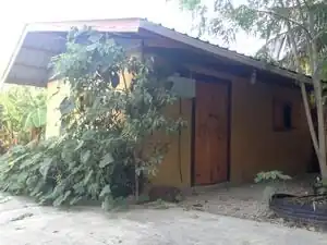 The straw bale house at Haiti Communitere was built by Builders Without Boarders. It was made entirely out of locally sourced materials. Straw bales from local rice fields were used as an insulation layer in the walls. The walls were finished with a natural plaster. The foundation was made with rubble from the 2010 Haiti earthquake and gravel bags made with tarps collected and sewn by people in earthquake affected regions. Old pallets were used as roof trusses. The house seems to fit a Haiti aesthetic and common two-room design.