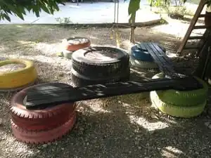 The tire benches at Haiti Communitere exemplify a way to turn waste material into something useful. A community in Haiti came to Haiti Communitere with a request for benches, so Haiti Communitere explored the idea of "using what you have" with them. The result was a bench made by filling tires with soil, then capping them with cement, and adding wood planks for long benches. Bottle caps also added aesthetic flourishes, and were saved from the waste stream.