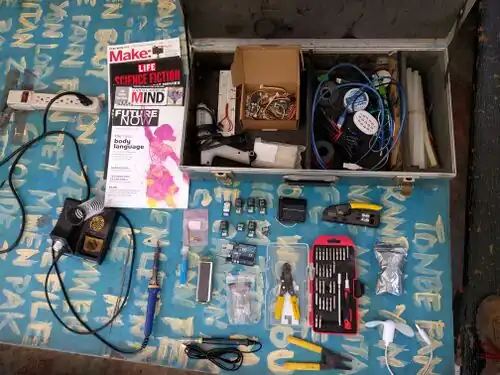All of the electronic repair stuff is in the blue case, probably sitting somewhere near the 3D printers, or maybe in the back room next to the time machine.
