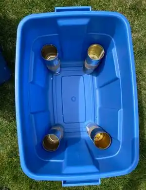Tape 4 pairs of the cans together end to end, place one pair in each corner of the bin without holes.