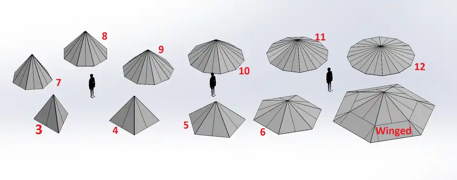 With triangles being a core part of the Hexayurt design, many different sided shapes become options. These shapes are mostly used as roof pieces to create yurts under by adding walls, but a key design consideration that can be seen is the expansion into Winged Designs.