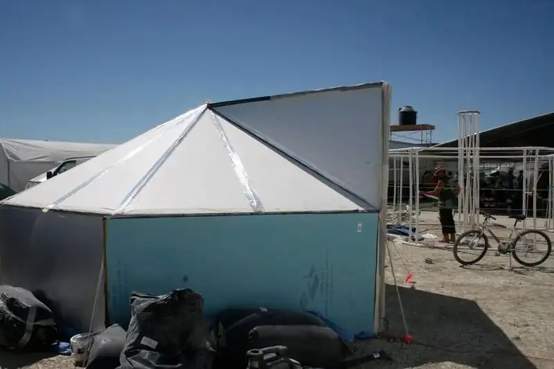 The Hexayurt was designed with the goal of creating a shelter that could be made from any standard sized sheet of material (4'x8'), built with common tools, and created with no material waste. With these considerations in mind, the Classic H12 Hexayurt was born. It uses 12 4x8 sheets, 6 cuts, and tape to assemble the pieces together. The shelter can be easily built from scratch by 2-3 people in a couple hours.