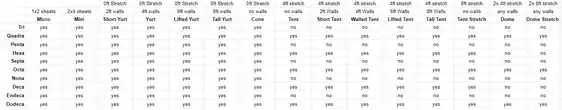 There may be some confusion between the "technical names" from this naming convention, and the common nicknames for the yurts. However, I see value in having some unification to talk about a variety of designs, as well as being able to predict new designs by making up a name. A Lifted Octatent Stretch would be an 8 sided shape, with 8ft extensions in the middle, and 6ft walls. I'm on the fence about building a calculator where you can input names, and it will automatically generate the sqft, volume, and required sheets to make different designs. But first, I'm finishing the master spreadsheet with existing designs.