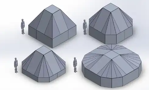 The domes are an extension of the Tent designs. Any Cone that has a number of sides divisible by 4 can be double stretched into a dome. These are unique from the Nearodesic domes since the follow the traditional yurt design characteristics. They can be stretched in both directions indefinitely, and lifted as high as you want same as the Basic Yurt designs.