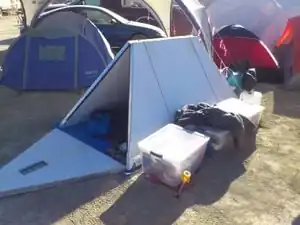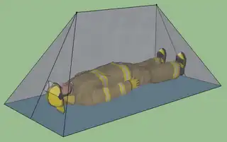 A Hexayurt H2 is a hexayurt-style structure with space for a single person or cozy couple and a few personal effects, nothing more. It is roughly the size of a single person hiking tent or a capsule hotel. The footprint is 4' x 8' with a height of 41 inches (a 6' person can sit straight inside).