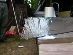 - Tape the tarp to the exterior bottoms of the walls so that the tarp is taut when the walls are spread to form a triangular prism with a 4 foot base (ie: once the tarp is taped, the wall bottoms cannot be spread further than 4 feet). This should be done with the end pieces positioned for fit - for a smoothly opening door the base should be slightly wider than 4 feet.