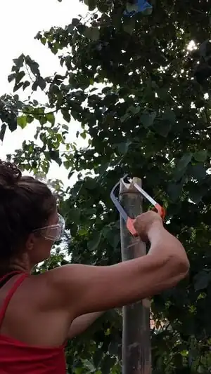 When harvesting bamboo, select poles that appear darker green to gray in color, and around 3-5 years of age. Cut just above the culm closest to the ground with a machete, and gently set bamboo on the ground to divide into desirable sizes.