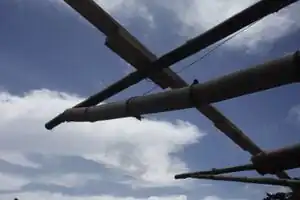 On the other side of the structure, we built a truss. The bottom bamboo pole has been cut to lock in with the pole on top. Wire was used to secure the poles together.