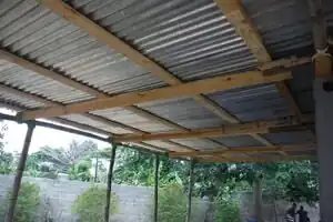 Set the beams in place and drill holes in the bamboo to secure with wire (we also used 2x4 beams because we needed install corrugated zinc metal sheets on the roof).