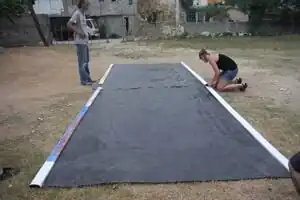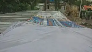 Measuring billboard, rolling and stapling across a 2x4 beam to attach to existing zinc roof and bamboo posts.