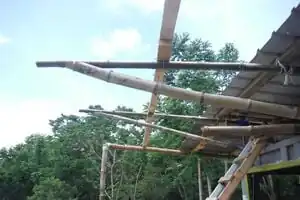 The tops of the bamboo columns are cut into a wide 'U' shape so that the bamboo beams cam be put into place.