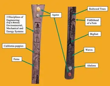 The final product consists of three major components: a 3D printed axe head, a handmade and laser etched wooden handle, and a 12 volt LED light system powered with a rechargeable internal battery. The axe head is composed of a two-piece set of 3D printed shells. The two pieces fit together and are connected by three pins found in the corners. The head was designed using the 3D modelling software, Solidworks and Fusion 360. The head measures about 12.5” x 8” x 2”. The two-piece head will be made of plastic used by the Stratasys F370 3D Printer. The axe handle is made of walnut using the bandsaw, belt sander, and orbital sanders. The handle is 39” long and 2” wide. The head of the handle is sanded to fit inside the 3D printed axe head. The battery is in a square cut out found on the handle inside the axe head. The axe handle has a laser etched design along one side of the length of the handle. The design is created digitally using Adobe stock images and PicsArt. The design includes symbols covering the three disciplines of engineering offered at Cal Poly Humboldt. The design also has many symbols representing Humboldt County such as redwoods, ferns, poppies and the bigfoot. The design is laser etched on the handle using an Omtech laser engraver cutting machine. The handle also has a gemstone inlay. There are two gemstones located above the laser design and one stone below the design at the base of the handle. There is also an abalone fragment on the bottom of the axe handle. The stones are of variable depth as they are different sizes. They range from ½” to ¼” deep. The stones are glued into notches created by a Dremel.