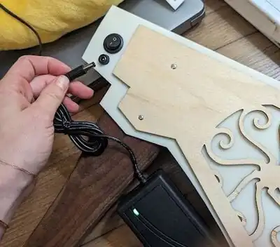 As you can see in the picture there is a toggle switch that powers the electrical components and a charging port to charge the axe. The "O" on the on/off switch is the off position and the "I" is the on position that controls the lights. The port below the on/off switch is where the battery is recharged. The charging chord adapter needed to charge the axe is DC barrel plug.