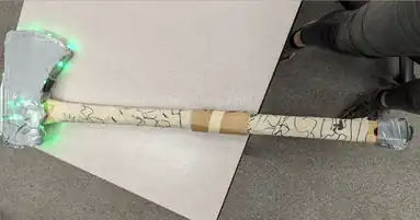 Multiple prototypes were created throughout the design process. The initial sketch, Figure 1-A, incorporates all of the different components discussed during brainstorming sessions. Overall the final design was very similar with only a few things different; such as the H shape, the design on the axe head, and the placement of the symbols and stones on the handle. Figure 1B shows the first physical prototype created with automotive interior LEDs and PVC. This protype was used to visualize size and for inspiration for the final design. In Figure 1C, the second prototype designed to test both functionality and appearance. This prototype was crafted using cardboard, an axe handle purchased from Ace Hardware, and constructed using duct tape. The second prototype was created specifically to assess the size and shape of the axe head. The Ace Hardware handle was customized by adding doodles drawn on a paper towel, and the axe head was given a traditional lumberjack-style appearance. This secondary prototype also served to experiment with button placement. Velcro stickers were strategically placed at different locations on the axe, and the feedback from individuals helped us determine the most intuitive spot for activating and deactivating the lights.
