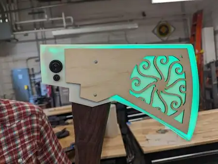 If this project were to bee recreated, there are a few lessons learned that should be incorporated into the new build. Instead of using walnut and linseed oil for the handle of the axe, a lighter wood or stain could be used. With the combination of stain and wood used, the handle came out darker than would have been preferred. As a result, the laser-etched designs are not recognizable from a long distance away and can only be seen up close. In the head of the axe, the electrical component density is very large. To mitigate this, a larger axe head should have been made or the electrical components should have been wired in a way that didn't put outward pressure on the axe head. The wiring placement negatively affected the fit of the two 3D printed axe head pieces. Instead of drilling into the axe head, the aesthetics would have looked better if screw holes were implemented into the 3D printed design to fit the axe head to the wood handle.