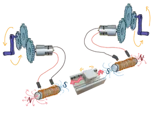 There is a hand crank that will be turned by people. This crank turns two sets of gears, where the larger gear is connected to the hand crank with a 50-toothed gear that turns a smaller 5-toothed gear. On the same axel, another 50 toothed gear is attached. This 50-toothed gear will then turn the last 5-toothed gear that then turns a DC motor for a 5000-rpm output with a 50rpm input, thus making enough power for the electromagnet.
