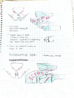 Refer to figure V2 Prototype Concept Drawings for the concept drawings of the second functional version of the Mag Lev prototype. The problems from the previous version that this new prototype hopes to improve were the visibility issue for the magnetic forces, as well as preemptively solve issues that had been identified with turning corners on the train track. Some testing for a parallel circuit of electromagnets was also involved at this stage, as shown [here].