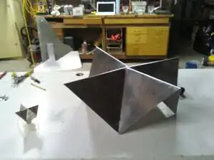 With the assist of a square metal tube of no larger of 3/4 of an inch wide, fold two of the diamonds in half to approximately 90 degrees and use sheet metal screws to fasten the diamonds with one folded corner to each other on to the metal tube. Create a X shape with diameter of 2 feet.