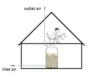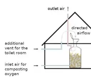 Passive ventilation is possible at cool outdoor temperatures by stack-effect if an additional air inlet pipe to the toilet room is installed. The additional airflow starts when the toilet lid is opened and stops when the lid is closed.