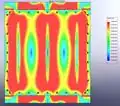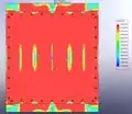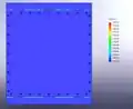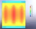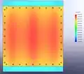 Very similar results were found for the steel plate (image is not shown). The image below represents temperatures across the bottom of the hot press for the same plate and it qualitatively appears that there are minimal temperature fluctuations across the bottom face of the plate. Again the steel plate simulation produced quantitatively indistinguishable results.