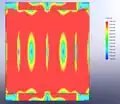 With these new constraints, results were obtained that better reflected the behaviours described by the users of the Kingston Hot Press. The image below represents temperatures across the bottom surface of the plate for an aluminum plate of 0.25" with the colour legend ranging from 485K-318K. The temperature non-uniformity is now clear.