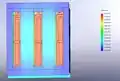 These equations when put into Excel or Calc can be solved iteratively (See this help for Excel). The screenshot below shows the three strip heaters (approximated as constant temperature surfaces) surrounded by the aluminum plate and the resulting temperature distribution. Although this is a rudimentary model, it provides an immediate sense of the geometry and gradient in a way that can be easily distributed and modified through OpenOffice.