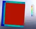 Using these constraints a numerical thermal analysis was performed. The image below represents temperatures across the top of the hot press for an aluminum plate of 0.25" with the colour legend ranging from 426K-313K.