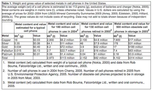 Now that we have discussed the basic components of cell phones, let's talk about what materials are required to manufacture cell phones. Several pounds of raw materials are required to manufacture one cell phone,[3] which only weighs a few ounces itself. Plastics and fiberglass are used for the housing and circuit board. Many different metals are found in cell phones (Table 1). A thin coat of gold is applied over the circuit board. Chips are soldered onto the circuit board with a metal compound. Metal is in the battery as well. It is interesting to note that in the manufacture of cell phones, there is enough mercury, lead, and arsenic in cell phones to classify them as hazardous waste.[1] Also, there is enough gold in 200 cell phones to make a gold ring.[1]