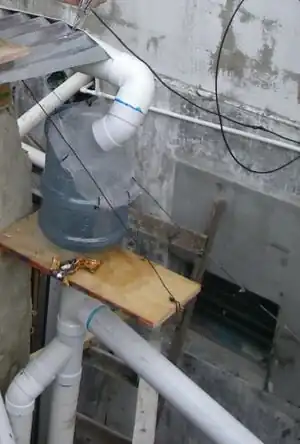 For the first flush, we used volumetric first flush using p.v.c. pipe. After calculating the amount desired to capture for the first flush, calculations were completed on the amount of p.v.c. pipe that would be needed to obtain the needed gallons for the first flush. Using the same design from the HSU Chiapas rainwater catchment, we cut and built the first flush with 3" p.v.c. pipe, as seen to the left.