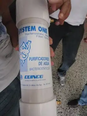 We also used an activated carbon with silver filter. This was one of the most inexpensive filters we found in the Dominican Republic, and will be easy to change in the system. This filter was chosen after discussion of what would work best within our system, and the pros and cons of different filter systems. The filter was then attached with P.V.C. adapter fittings and attached the filter to the wall to prevent theft and weather security issues.