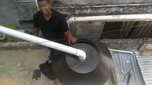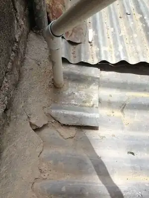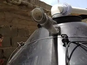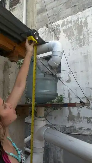 A 3" PVC pipe is used for the gutter. The PVC pipe is cut down the middle and then attached to the area of catchment using wire to keep the gutter in place. At the end of the gutter is a 90º PVC pipe, to ensure that the runoff water flows directly into the primary screening and then enters the first flush. |