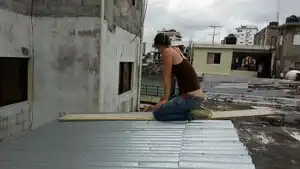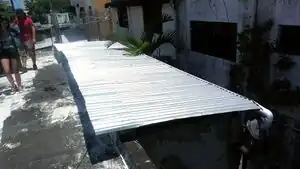 The La Yuca rainwater catchment system uses the galvanized steel roof of La Yuca ecoladrillo schoolroom as its catchement area. The system catchment area is approximately 175 ft2 (16 m2). The use of a steel roof galvanized in zinc reduces the amount of rust that will form on the area of catchment and enter the system. |