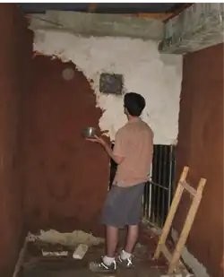The strongest test was a mixture of just sand, flour paste, and cal, but we decided not to use it based on a lack of existing research or data on using a mixture without clay. One square of the mixture was put above the back door, so in a year the durability of the patch can be compared with the rest of the wall. The mixture for the patch is: 1/50th parts lime dissolved in 1 part water, 2 parts flour paste, and 5 parts sand.