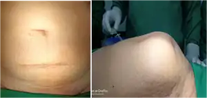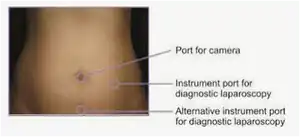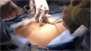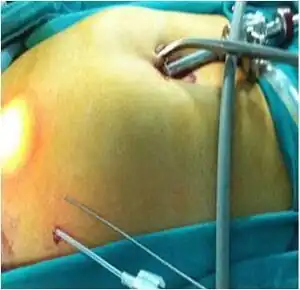 - After the incision the abdominal wall below, the umbilicus is lifted in the mid line by the surgeon or on both sides by surgeon and assistant.