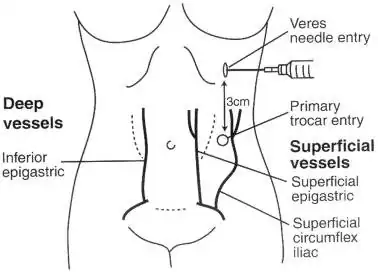 In this method, a 1-1.5cm skin and subcutaneous deep incision is made (linea alba or rectus sheath should not be incised) and through this the Veress needle for pneumoperitoneum and primary trocar are inserted.