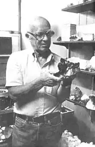 Mr. Ezard holds up a piece of smokey quartz. In the background you can see the vibrator polisher and several different kinds of rocks.