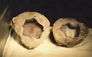 When the geode has been cut in half, the crystal formations and different layers become visible. Geodes that are solid inside are called thundereggs.