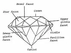 The drawing shows the parts of a brilliant cut in faceting.
