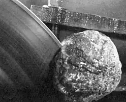 To get into the hollow part without breaking the rock apart, the collector has to saw through it with a rock saw which has a diamond-embedded blade, and he needs to use kerosene and crankcase oil for a coolant. This process takes a long time and must be done carefully. The rock must be clamped into place very tightly before cutting or it may go flying out as soon as the blade starts.